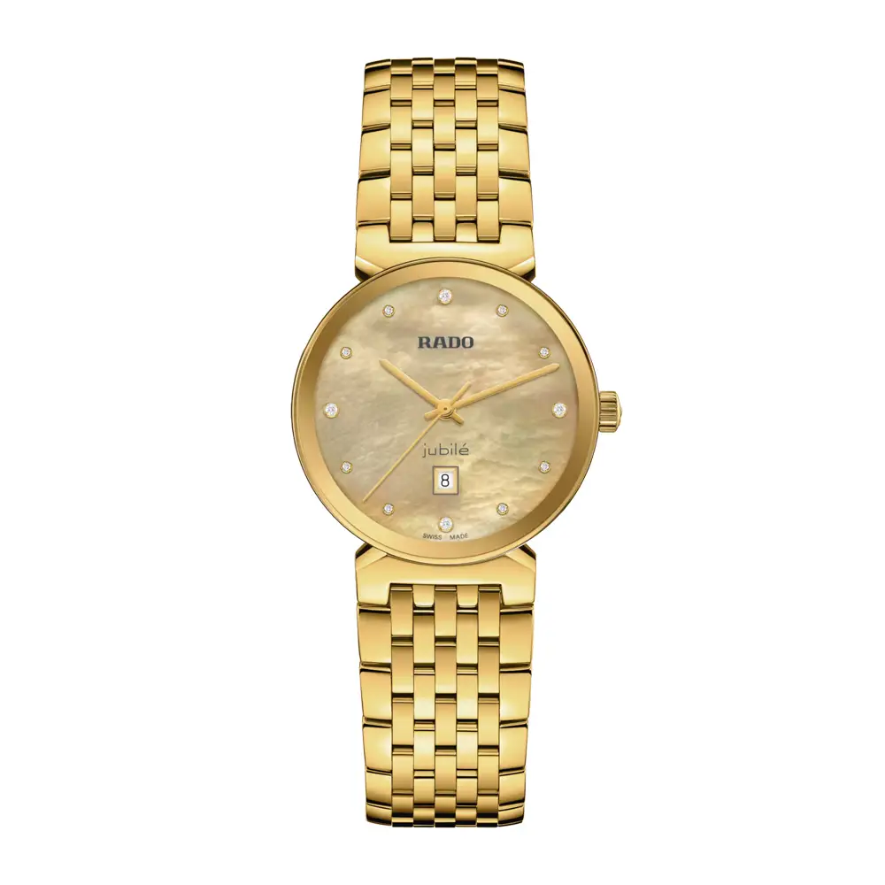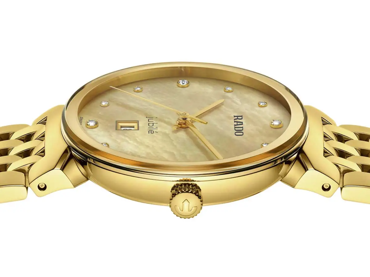Rado Florence Diamonds R48915903 là hiện thân của sự thanh lịch, nữ tính và độ chính xác Thụy Sĩ trong một thiết kế hài hòa tinh tế. Vỏ thép không gỉ 30 mm phủ PVD vàng kết hợp hoàn hảo với dây đeo thép cùng tông màu, tạo nên tổng thể sang trọng và thanh thoát. Mặt số xà cừ đính 12 viên kim cương mang lại vẻ đẹp rực rỡ, trong khi mặt kính sapphire cắt pha lê đảm bảo khả năng chống trầy xước và độ rõ nét tối ưu.