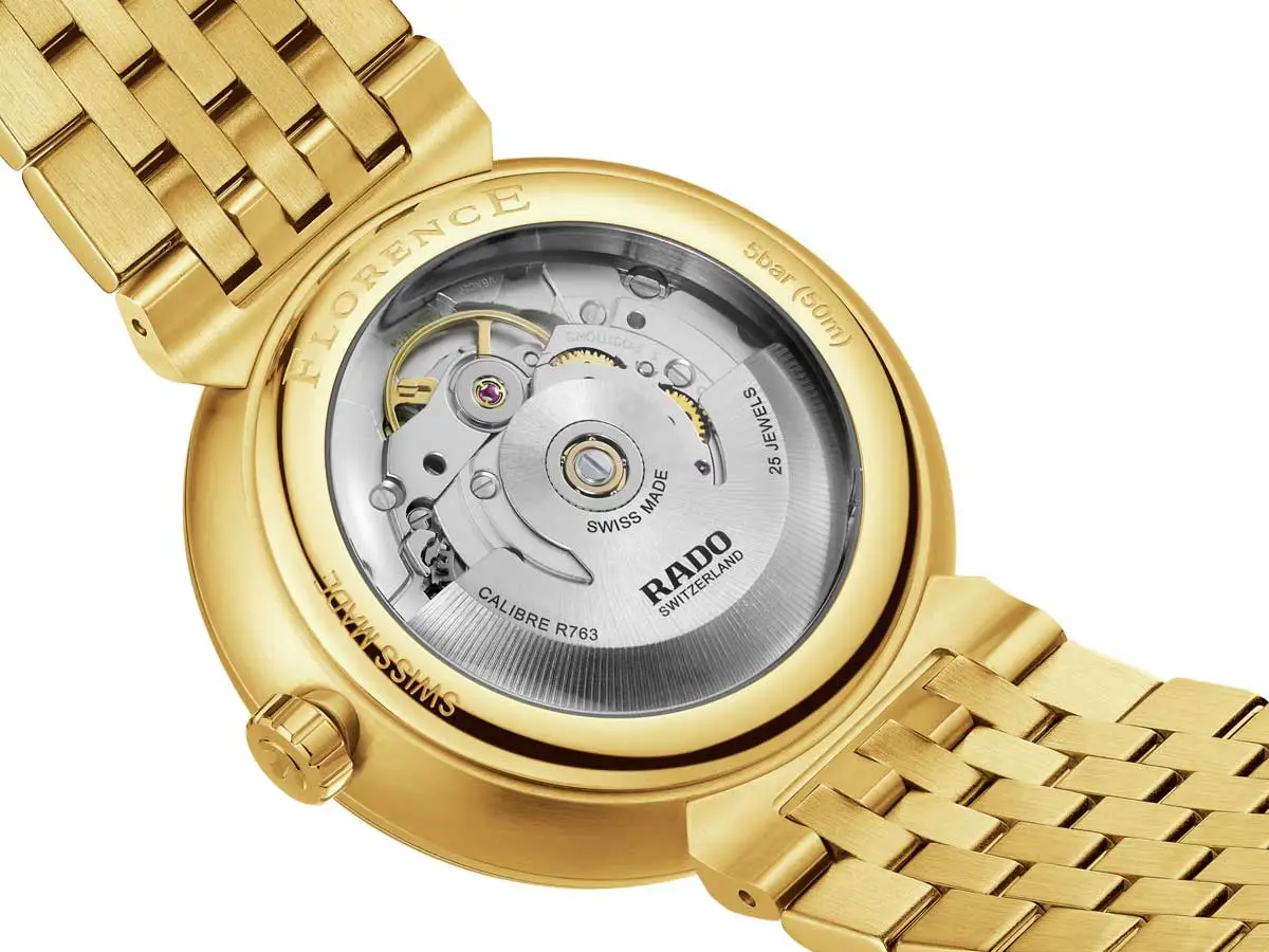 Rado Florence Automatic R48904013 là sự kết hợp hài hòa giữa sự thanh lịch, truyền thống và độ chính xác Thụy Sĩ. Lấy cảm hứng từ vẻ đẹp kiến trúc của Florence, mẫu đồng hồ này tỏa ra vẻ đẹp nữ tính vượt thời gian. Vỏ thép không gỉ 30 mm phủ PVD vàng kết hợp liền mạch với dây đeo cùng tông màu, tạo nên dáng vẻ tinh tế và ôm sát cổ tay.