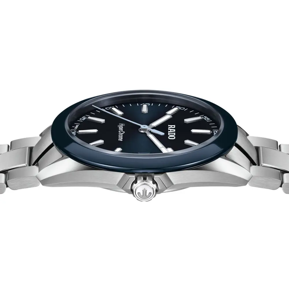 Rado HyperChrome 41.5 mm gây ấn tượng với thiết kế thể thao sang trọng, độ bền cao và kiểu dáng tinh tế. Vỏ đồng hồ bằng thép không gỉ được kết hợp với vành bezel chắc chắn làm từ gốm công nghệ cao, mang lại khả năng chống trầy xước vượt trội. Mặt số màu xanh đậm với hiệu ứng tia nắng mặt trời được trang trí bằng kim và vạch chỉ giờ có lớp phát quang Super-LumiNova®, với kim giây phát sáng màu xanh lá và các chi tiết khác màu xanh dương. Đồng hồ được bảo vệ bởi kính sapphire có lớp chống phản chiếu và chống nước ở độ sâu 150 mét .