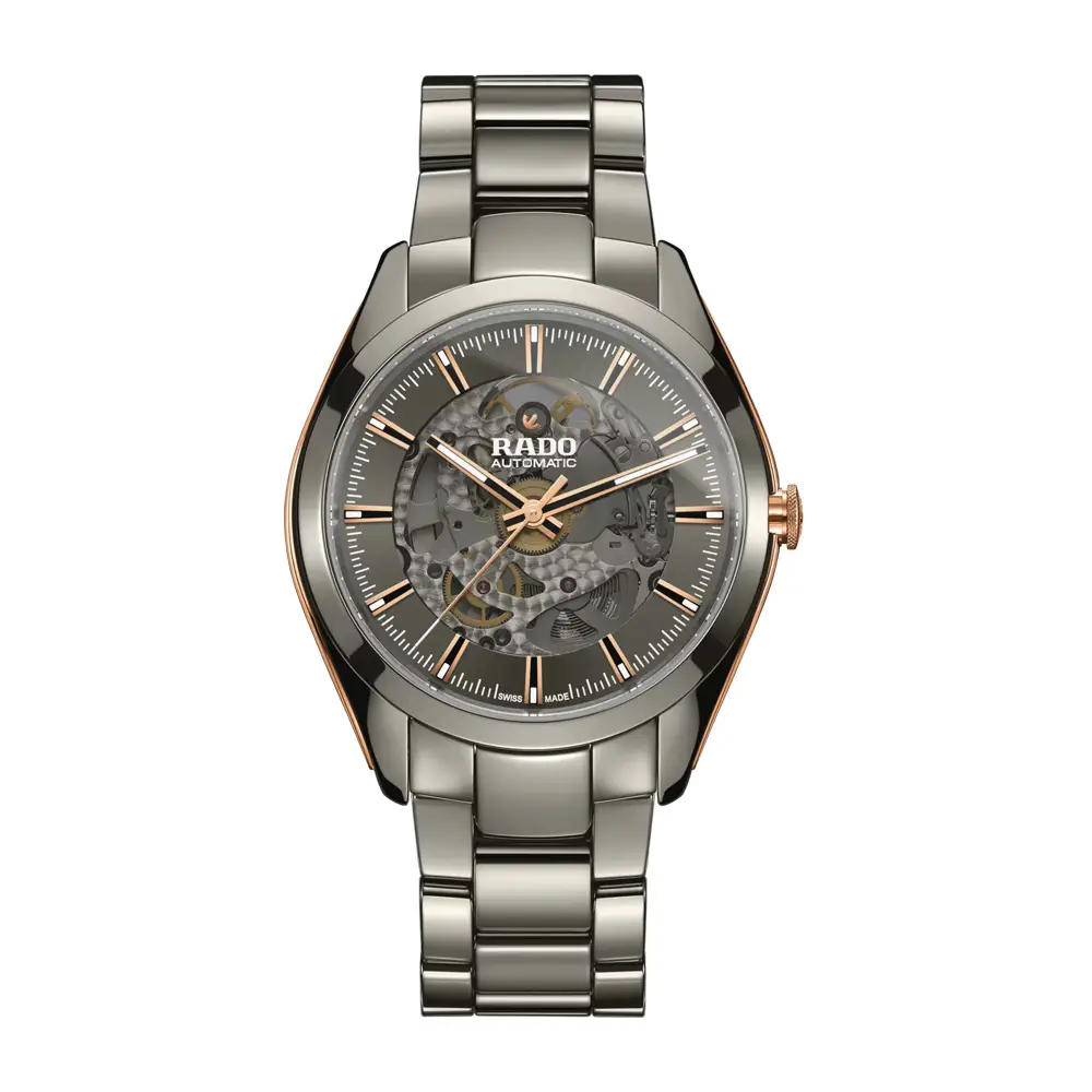 Rado HyperChrome Automatic Open Heart R32021102 thể hiện sự cân bằng hoàn hảo giữa phong cách thể thao thanh lịch, đổi mới và độ chính xác Thụy Sĩ. Vỏ gốm công nghệ cao plasma 42 mm mang vẻ sáng bóng kim loại, nhẹ và có khả năng chống trầy xước tuyệt vời. Nắp lưng titan cùng dây đeo gốm – thép tích hợp mang lại cảm giác thoải mái và bền bỉ.