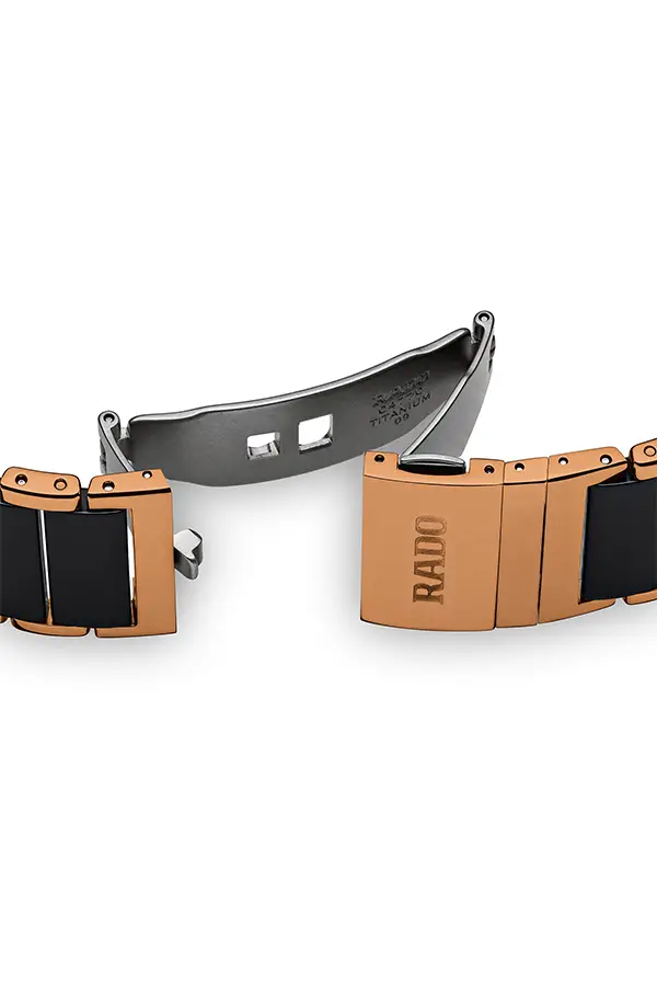 Dây đeo gốm và thép liền khối với tông màu vàng hồng hài hòa cùng vỏ, mang lại cảm giác thoải mái và vẻ đẹp tinh tế. Rado Integral R20612712 là biểu tượng của phong cách nữ tính, sự tinh xảo Thụy Sĩ và vẻ đẹp vượt thời gian.