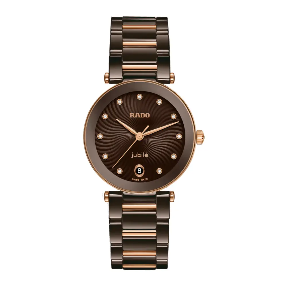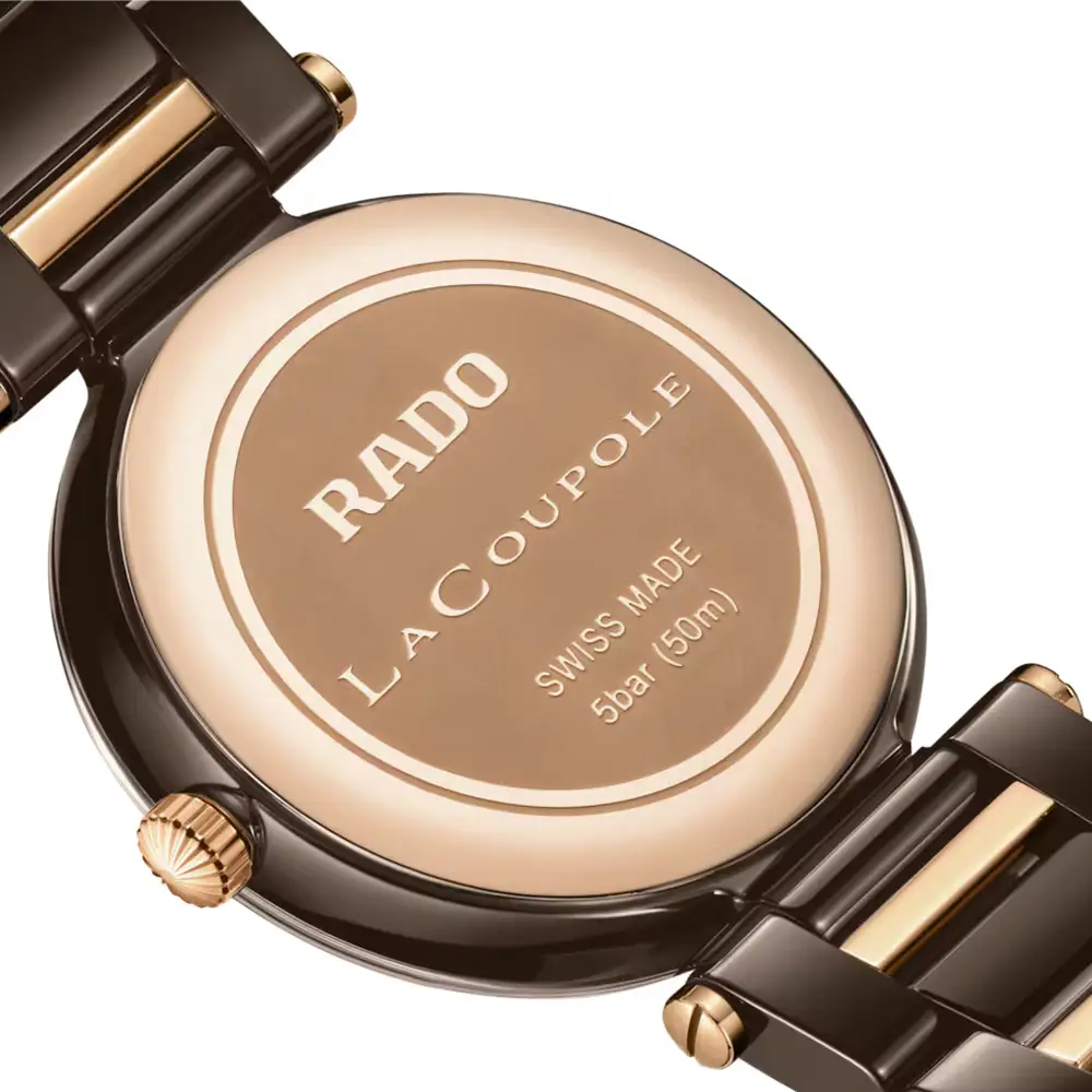 Đồng hồ nữ Rado La Coupole Diamonds R22242703 là sự kết hợp hoàn hảo giữa độ chính xác Thụy Sĩ, công nghệ tiên tiến và vẻ đẹp tinh tế. Vỏ 31 mm bằng gốm cao cấp màu nâu bóng được kết hợp với viền thép không gỉ phủ màu vàng hồng, mang đến sự ấm áp và thanh lịch.
