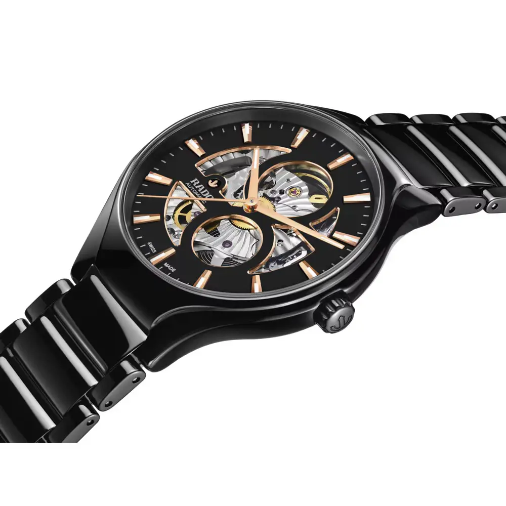 Đồng hồ Rado True Round Automatic Open Heart là cách diễn giải hiện đại của nghệ thuật chế tác đồng hồ Thụy Sĩ, dựa trên việc ứng dụng gốm công nghệ cao mang tính biểu tượng của Rado. Vỏ gốm công nghệ cao màu đen được đánh bóng mang lại vẻ ngoài thanh lịch, nhẹ và vô cùng bền bỉ, trong khi thiết kế Open Heart cho phép quan sát chuyển động cơ học bên trong. Tổng thể thiết kế tinh giản, sang trọng và hài hòa.