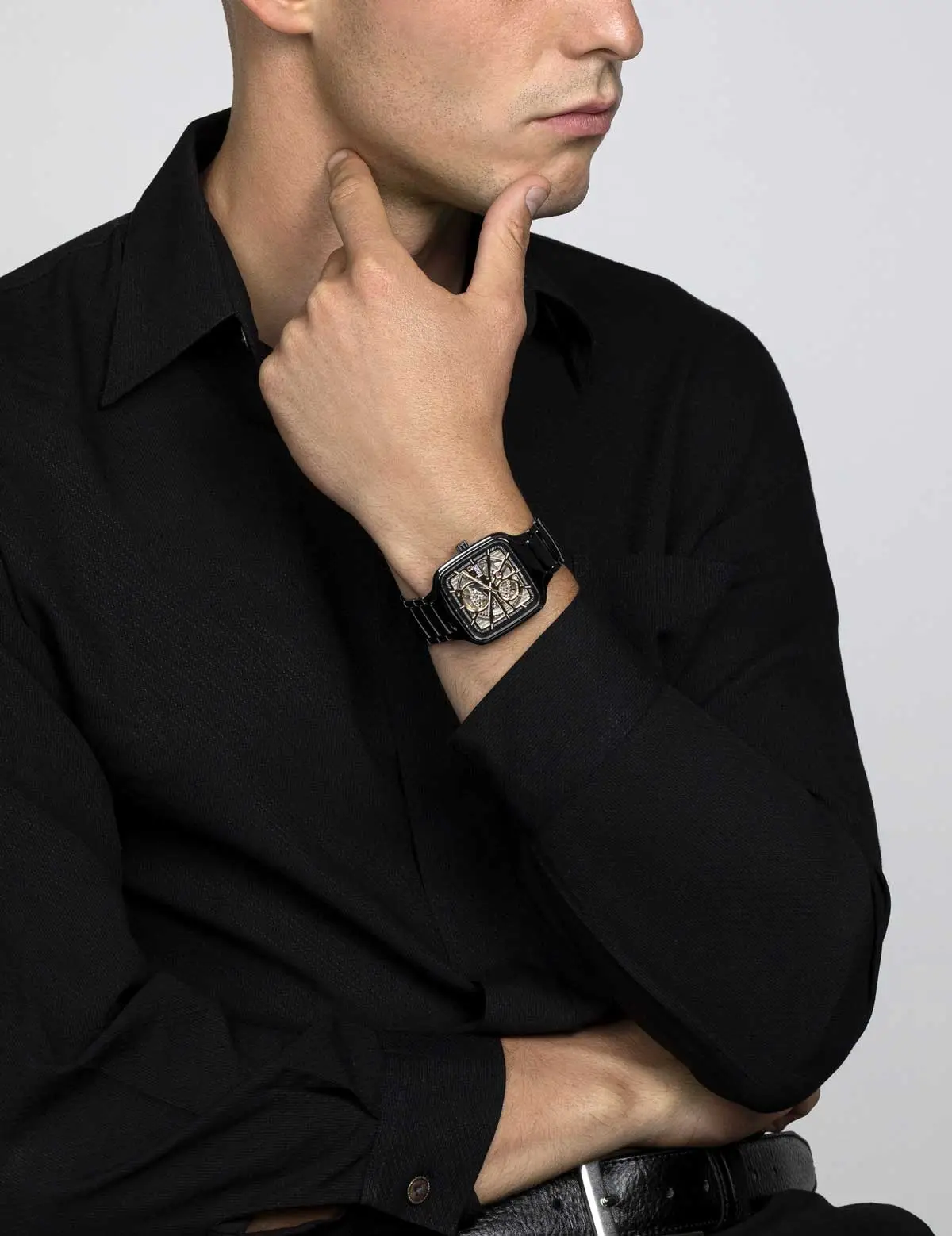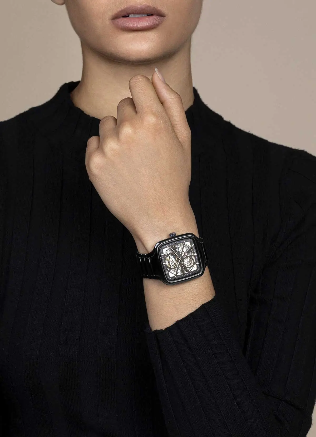 Rado True Square Automatic Open Heart R27086162 mang đến phong cách hiện đại cho thiết kế vuông biểu tượng của Rado. Vỏ gốm công nghệ cao 38 mm nhẹ, chống trầy xước và thân thiện với da, tạo cảm giác thoải mái khi đeo. Mặt số đen lộ cơ (open heart) cho phép chiêm ngưỡng chuyển động tinh xảo của bộ máy, trong khi kính sapphire chống phản chiếu đảm bảo độ trong suốt và bảo vệ hoàn hảo.