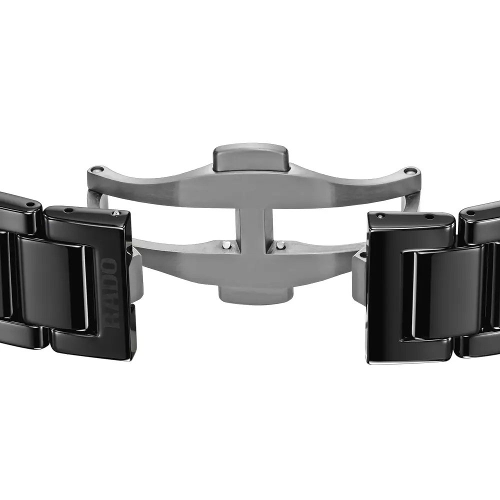 Mặt số analog màu đen thanh lịch làm nổi bật vẻ đẹp tinh tế nhưng cũng rất cá tính. Kính sapphire bảo vệ mặt số, đảm bảo độ bền và khả năng đọc lâu dài. Dây đeo gốm đen sang trọng kết hợp với khóa gập tiện lợi, giữ đồng hồ chắc chắn và êm ái trên cổ tay.
