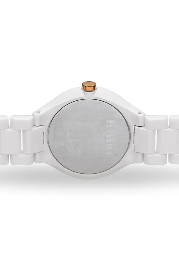 Dây đeo gốm trắng liền khối hài hòa với vỏ, mang lại cảm giác thoải mái tuyệt đối. Với khả năng chống nước 30 m (3 ATM), đồng hồ phù hợp cho sử dụng hằng ngày. Rado True Thinline R27958722 là biểu tượng của nét nữ tính hiện đại, sự nhẹ nhàng và thiết kế vượt thời gian, dành cho những ai yêu thích phong cách thanh lịch và tinh giản.