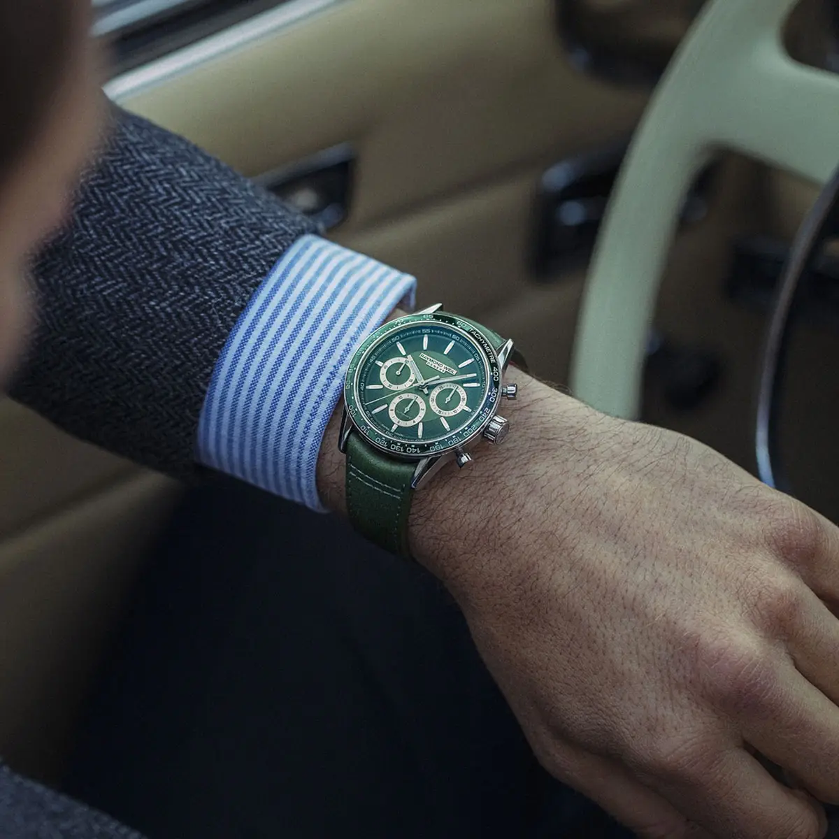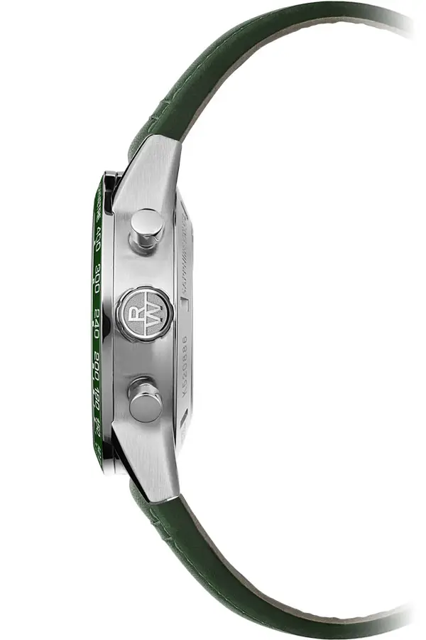 Vỏ thép không gỉ 43,5 mm được hoàn thiện xen kẽ giữa bề mặt đánh bóng và phay xước, đi kèm vành bezel gốm màu xanh có thang đo tachymeter, vừa mang tính thẩm mỹ vừa tiện dụng. Mặt số xanh với ba mặt phụ chronograph và ô lịch giữa vị trí 4 và 5 giờ đảm bảo khả năng hiển thị tối ưu; kim và cọc số phủ Super-LumiNova® dễ đọc trong mọi điều kiện ánh sáng.