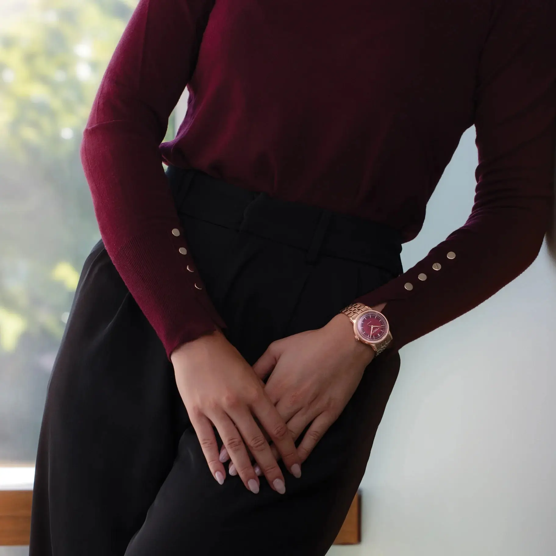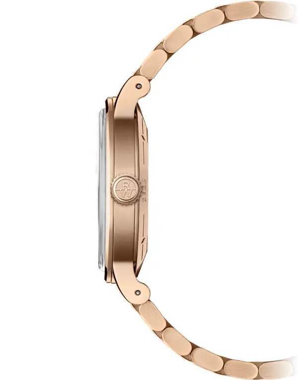Điểm nhấn của đồng hồ là mặt số màu đỏ rượu (bordo), tạo chiều sâu và phong cách độc đáo. Bên trong là bộ máy cơ tự động RW4200 với dự trữ năng lượng khoảng 41 giờ, nổi tiếng về độ chính xác và độ bền.