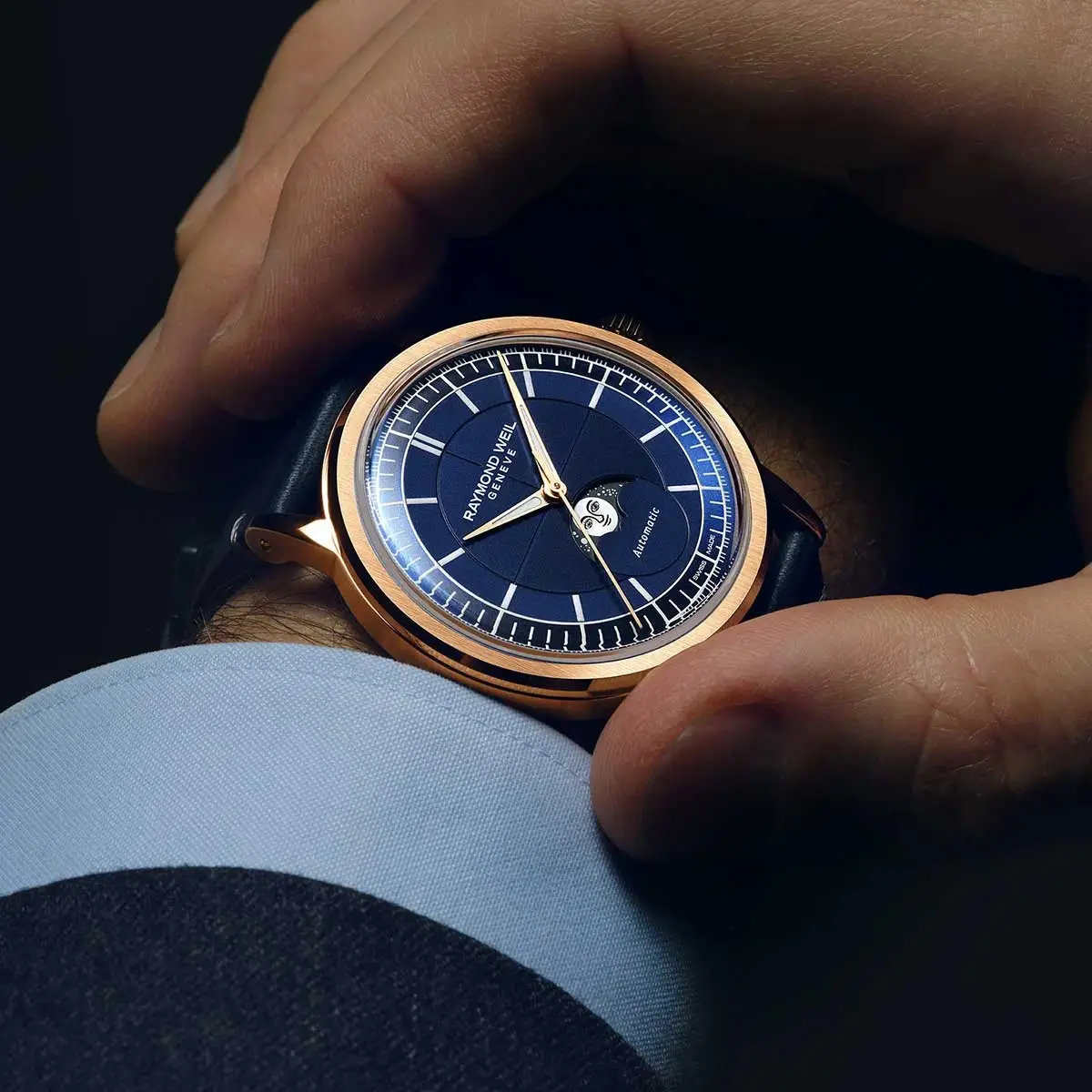 Hoàn thiện với dây da bê màu xanh có đường chỉ chữ W đặc trưng và khóa gập phủ PVD vàng hồng, chiếc Raymond Weil Millesime 2945-PC5-50001 là lựa chọn hoàn hảo cho quý ông yêu thích sự tinh tế, truyền thống Thụy Sĩ và vẻ đẹp của chu kỳ trăng.