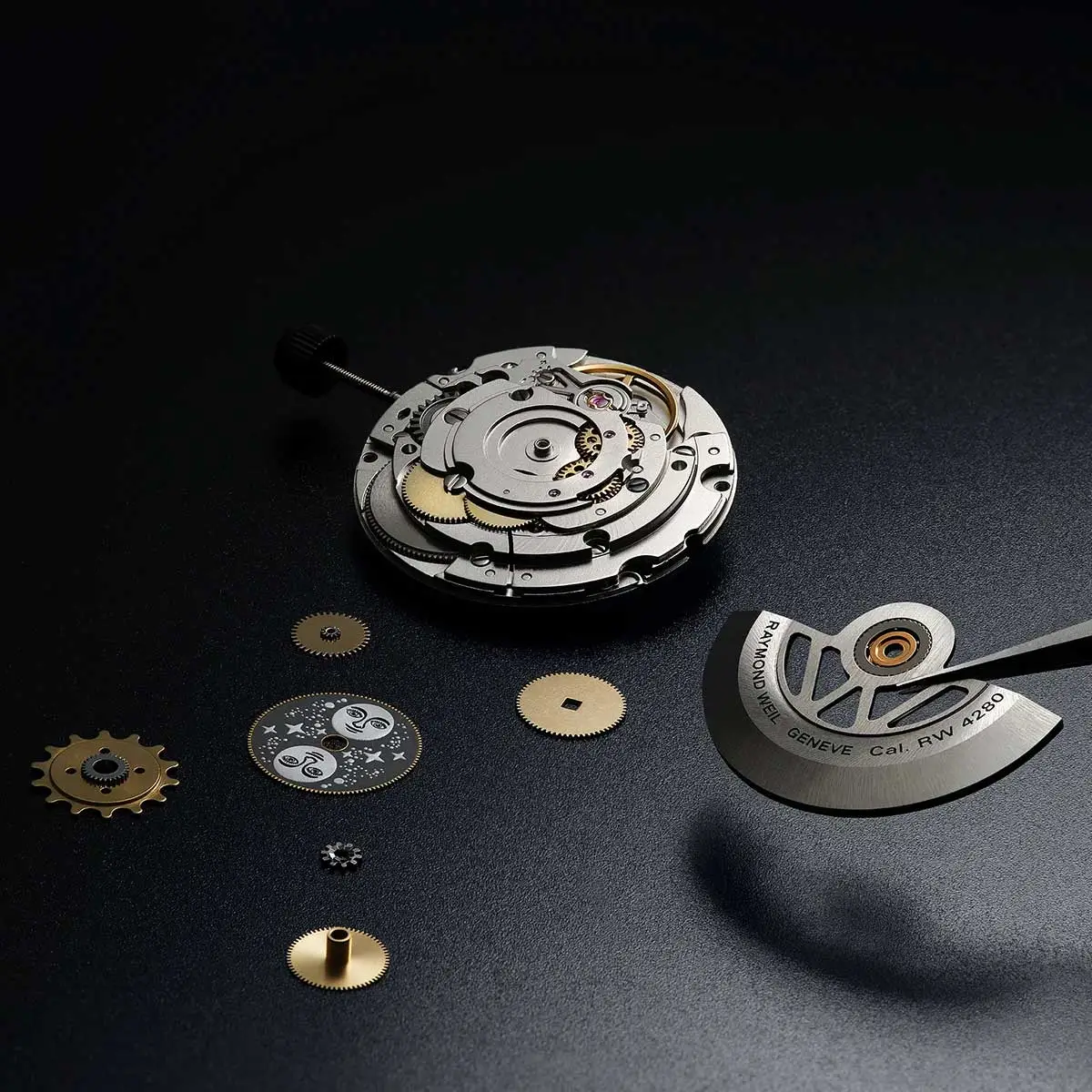 Bên trong là bộ máy cơ tự động RW4280 với dự trữ năng lượng 38 giờ, đảm bảo độ chính xác và vận hành mượt mà. Nắp lưng sapphire trong suốt cho phép chiêm ngưỡng rotor được trang trí biểu tượng Raymond Weil – minh chứng cho tay nghề thủ công Thụy Sĩ. Với khả năng chống nước 50 m, đồng hồ phù hợp cho cả sử dụng hàng ngày lẫn những dịp đặc biệt.