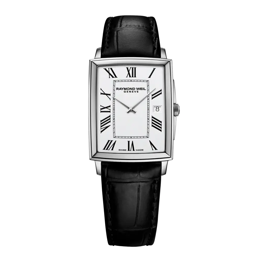 Raymond Weil Toccata 5425-STC-00300 mang đến kiểu dáng mặt vuông cổ điển, phong cách tối giản và độ chính xác Thụy Sĩ. Vỏ đồng hồ 37,25 × 29,60 mm bằng thép không gỉ được trang bị kính sapphire chống trầy xước, bảo vệ mặt số màu trắng với chữ số La Mã màu đen và lịch ngày tại vị trí 3 giờ.