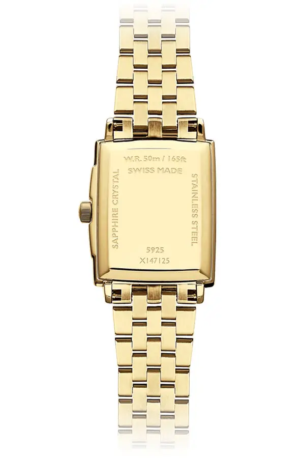 Đồng hồ có vỏ chữ nhật bằng thép không gỉ mạ vàng, kích thước 23,4 × 34,6 mm, mặt số được bảo vệ bởi kính sapphire chống trầy xước. Khả năng chống nước 5 ATM / 50 mét giúp an tâm sử dụng hằng ngày.