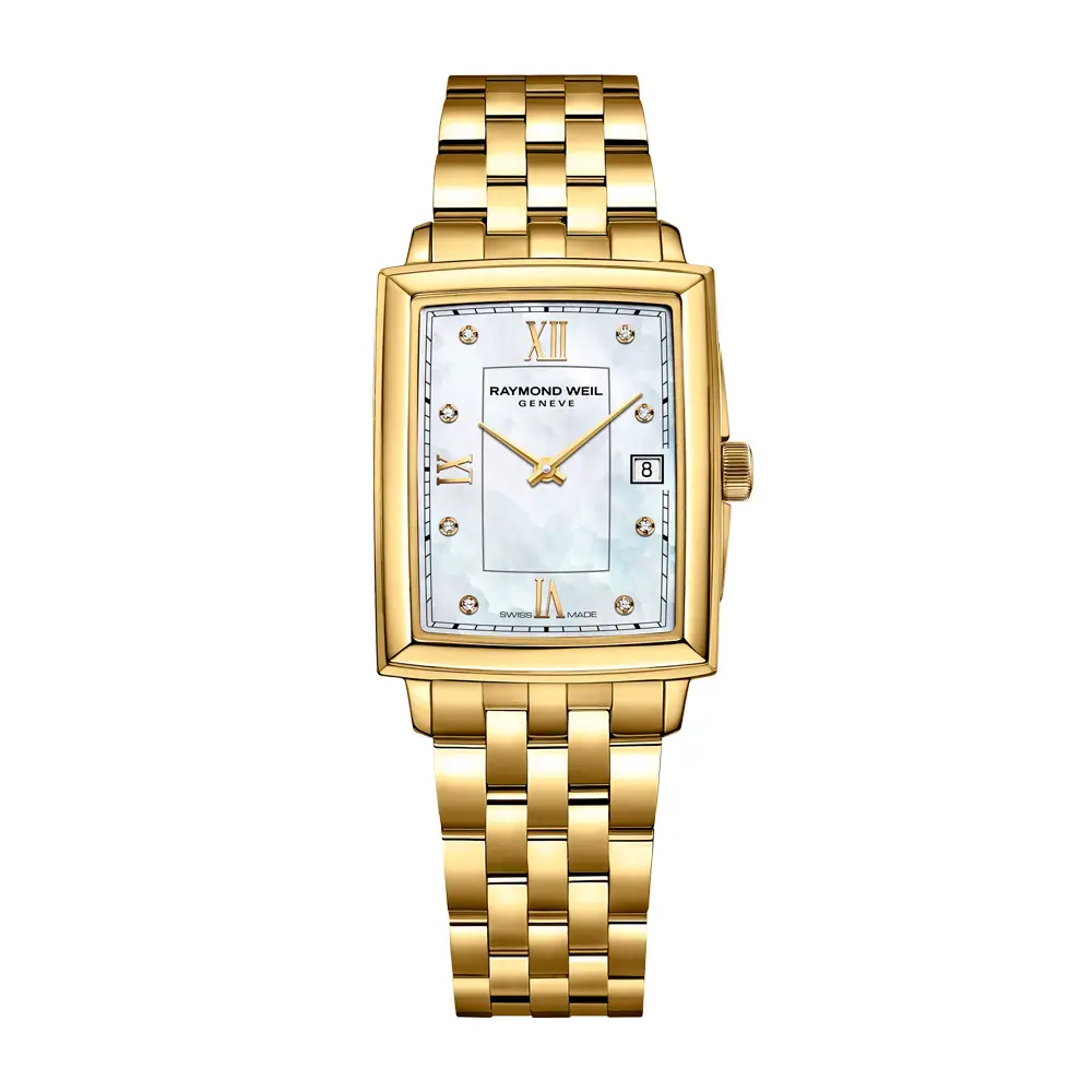Raymond Weil Toccata 5925-P-00995 là mẫu đồng hồ nữ sang trọng kết hợp giữa nét thanh lịch cổ điển với chi tiết vàng và kim cương tinh tế. Thuộc bộ sưu tập Toccata, mẫu này rất phù hợp với những quý cô muốn tìm một phụ kiện vừa nổi bật vừa tinh tế cho cả trang phục thường ngày lẫn trang trọng.