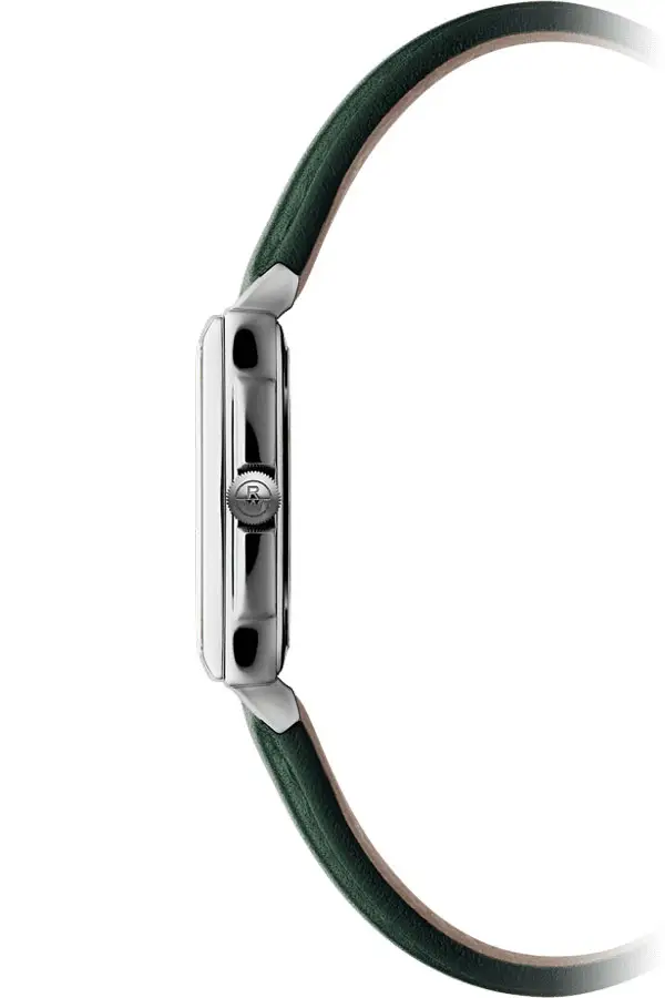Dây đeo bằng da màu xanh lá kết hợp với khóa gài truyền thống, tạo sự đồng bộ trong thiết kế và mang lại cảm giác đeo thoải mái. Đồng hồ còn chống nước ở mức 5 ATM / 50 mét, phù hợp với tiếp xúc nước hàng ngày như rửa tay hay đi mưa nhẹ.