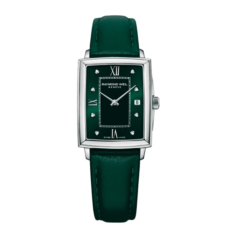 Đồng hồ nữ Raymond Weil Toccata 5925-STC-00521 là sự hiện thân thanh lịch của truyền thống chế tác đồng hồ Thụy Sĩ cổ điển, kết hợp tinh tế giữa sự nhẹ nhàng, độ chính xác và thiết kế sang trọng. Mẫu đồng hồ này thuộc bộ sưu tập Toccata, nổi bật với vỏ hình chữ nhật bằng thép không gỉ có kích thước 22,6 × 28,1 mm. Đường nét thanh thoát của vỏ được tôn lên bởi mặt số analog màu xanh lá cây, được đính các chỉ số kim cương tinh xảo và có ô cửa hiển thị ngày tiện lợi.