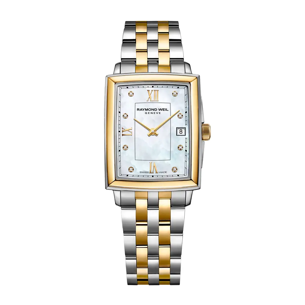 Raymond Weil Toccata 5925-STP-00995 là sự kết hợp hoàn hảo giữa phong cách Art Deco, nét tinh tế nữ tính và độ chính xác Thụy Sĩ. Vỏ đồng hồ 22,6 × 28,1 mm bằng thép không gỉ phủ vàng PVD được trang bị kính sapphire chống trầy xước. Mặt số xà cừ được tô điểm bởi 8 viên kim cương và chữ số La Mã, mang đến vẻ đẹp sang trọng và vượt thời gian.