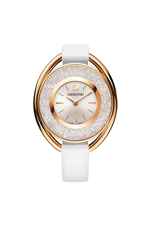 Mẫu đồng hồ nữ thuộc bộ sưu tập Crystalline Oval có thiết kế gợi nhớ đến hình dáng của một con mắt. Ở trung tâm, mặt số trắng được đặt trong các vòng tròn đồng tâm, bao quanh bởi một dải vàng hồng với 1.700 viên pha lê Swarovski trong suốt. Viền oval được cố định bằng một dây đeo da trắng.
