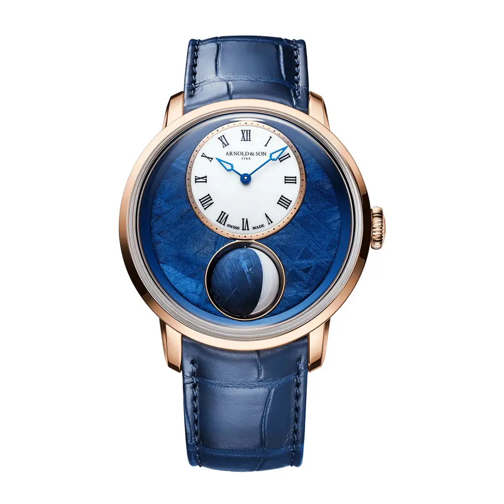 Vỏ đồng hồ 44 mm được chế tác từ vàng đỏ 18K, mang đến vẻ đẹp sang trọng và quý phái. Mặt số được làm từ thiên thạch phủ PVD xanh dương, gợi nhớ bầu trời đêm huyền bí. Mặt phụ hiển thị giờ và phút được làm từ đá opal trắng sữa, hài hòa tuyệt đẹp với chức năng pha mặt trăng.