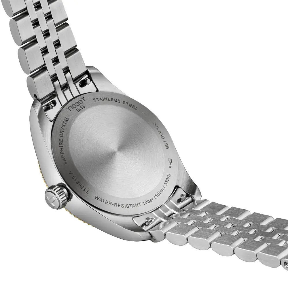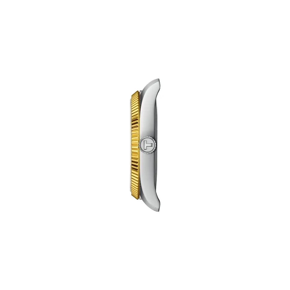 Mẫu Tissot Ballade 34 mm mang đến sự hài hòa giữa vẻ thanh lịch và thuần khiết theo phong cách nữ tính, được nhấn mạnh bởi đường kính 34 mm và thiết kế hai tông thép không gỉ với lớp phủ PVD vàng vàng. Mặt số bạc với họa tiết guilloché tinh tế và các cọc số đính nổi tạo nên nét sang trọng, trong khi tỷ lệ cân đối đem lại sức hút vượt thời gian.
