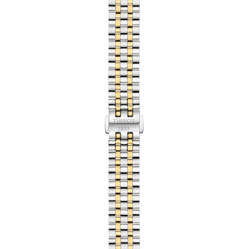 Tissot Carson Premium Lady T122.210.22.033.00 mang đến sự kết hợp tinh tế giữa phong cách cổ điển và vẻ đẹp sang trọng như trang sức. Thiết kế hai tông màu (bicolor) kết hợp thép không gỉ 316L với lớp phủ PVD vàng, tạo nên diện mạo nữ tính và vượt thời gian. Vỏ 30 mm với độ mỏng khoảng 6,7 mm tăng thêm nét thanh lịch, còn mặt số bạc được trang trí chữ số La Mã và lịch ngày tại vị trí 6 giờ.