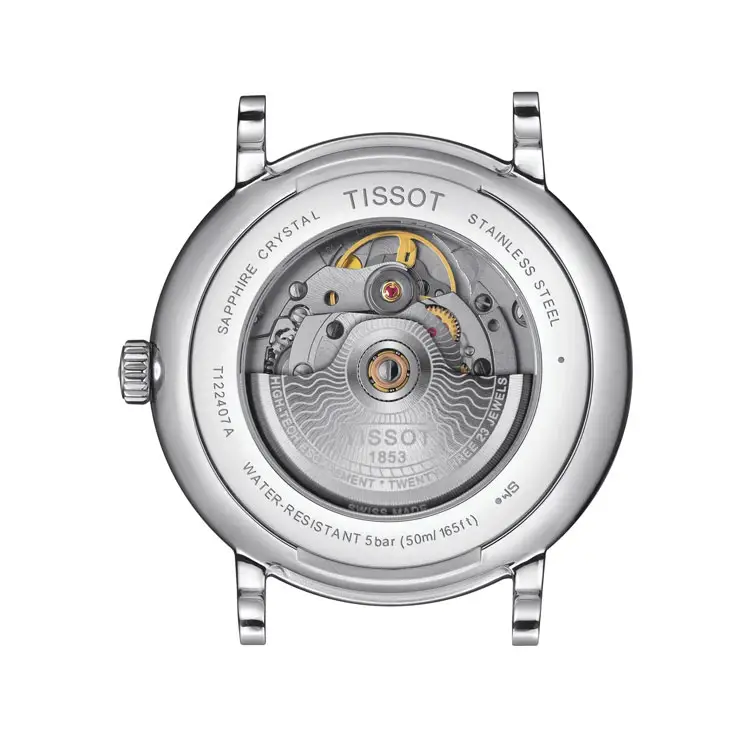 Tissot Carson Premium Powermatic 80 T122.407.11.033.00 là mẫu đồng hồ thanh lịch kết hợp giữa thiết kế cổ điển và công nghệ Thụy Sĩ hiện đại. Vỏ tròn bằng thép không gỉ đường kính 40 mm được bảo vệ bởi kính sapphire chống trầy xước và đi kèm mặt số màu bạc tinh tế với các cọc số thanh mảnh cùng lịch ngày tại vị trí 6 giờ.