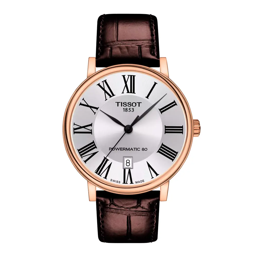 Tissot Carson Premium Powermatic 80 là mẫu đồng hồ nam thanh lịch, kết hợp giữa thiết kế cổ điển và công nghệ hiện đại. Đồng hồ có vỏ thép không gỉ 40 mm phủ PVD vàng hồng, mặt số bạc với số La Mã, và dây da nâu với khóa cài. Kính sapphire cong chống phản chiếu tạo vẻ sang trọng và chống trầy xước.