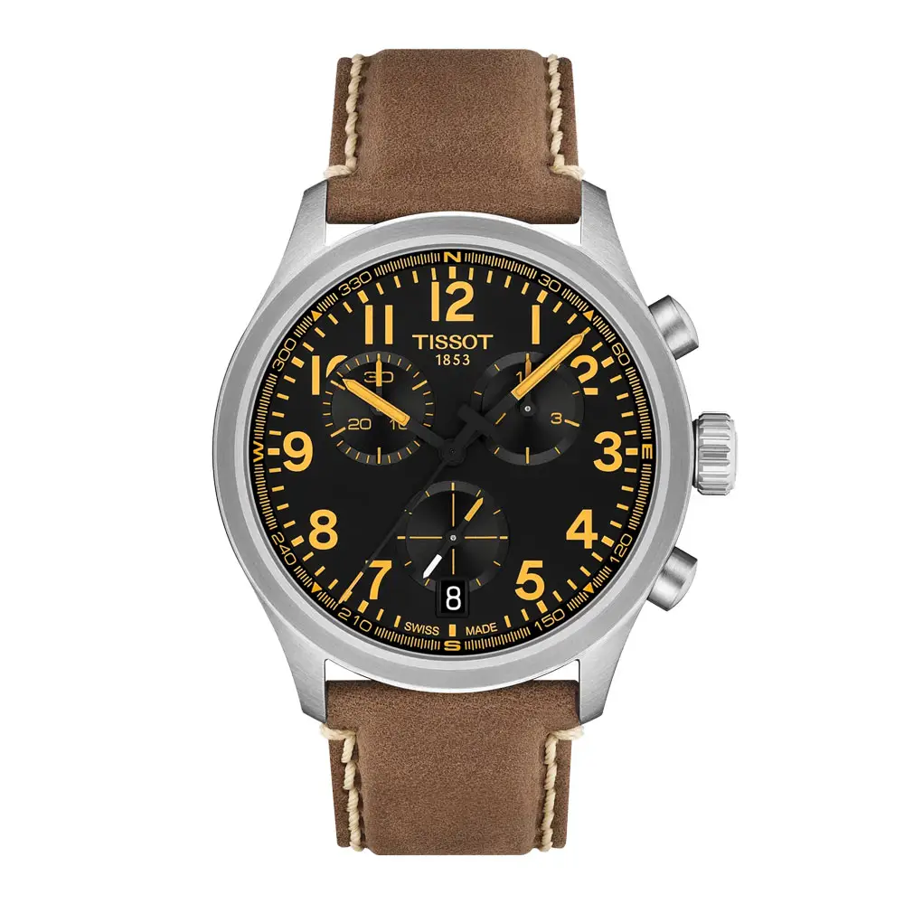 Điểm nhấn là mặt số màu đen với chi tiết màu vàng và số Ả Rập, giúp dễ đọc. Kim phủ Super-LumiNova® hỗ trợ xem giờ trong điều kiện thiếu sáng. Đồng hồ có chức năng chronograph (1/10 giây, 30 phút) và lịch ngày. Dây da màu be với đường chỉ tương phản và thay nhanh tạo phong cách thể thao.