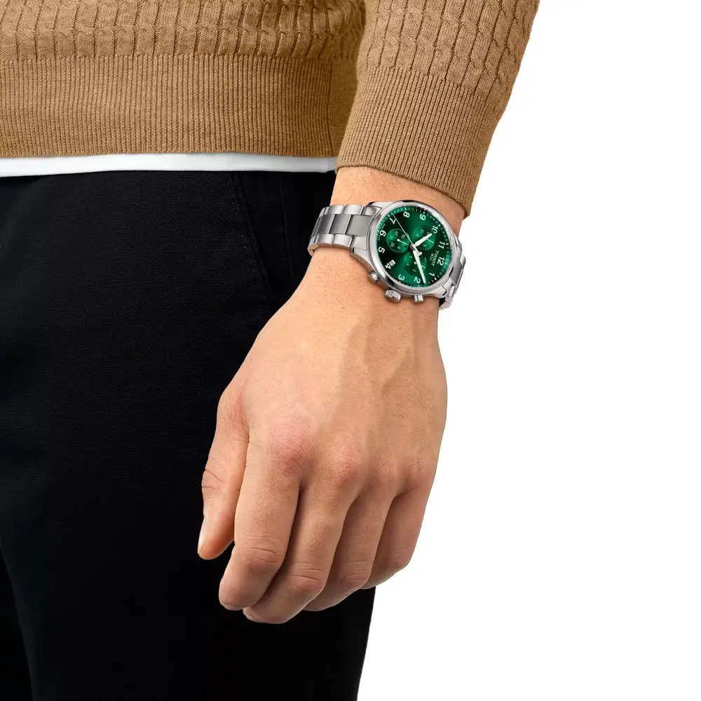 Mặt số analog màu xanh lá nổi bật với các cọc số tương phản và lịch ngày, mang lại diện mạo hiện đại nhưng vẫn mang tính trường tồn. Đồng hồ còn được trang bị tính năng chronograph, lý tưởng cho những ai yêu thích đo thời gian chính xác.
