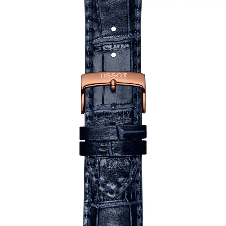 Dây da màu xanh lam với vân cá sấu được hoàn thiện bằng khóa kim tiêu chuẩn khắc logo Tissot, mang lại cảm giác đeo chắc chắn và thoải mái.