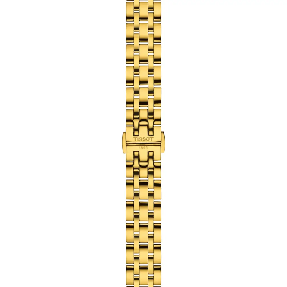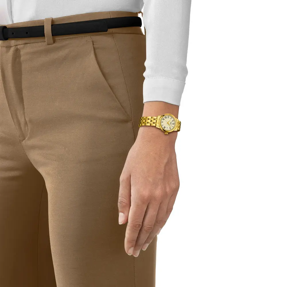 Tissot Classic Dream 28mm mang đến sự kết hợp tinh tế giữa vẻ đẹp cổ điển và sự sang trọng nhẹ nhàng. Vỏ thép 316L đường kính 28 mm phủ PVD vàng vàng tạo nên diện mạo như một món trang sức cao cấp, trong khi kính sapphire và khả năng chống nước 5 bar đảm bảo độ bền trong sử dụng hằng ngày.