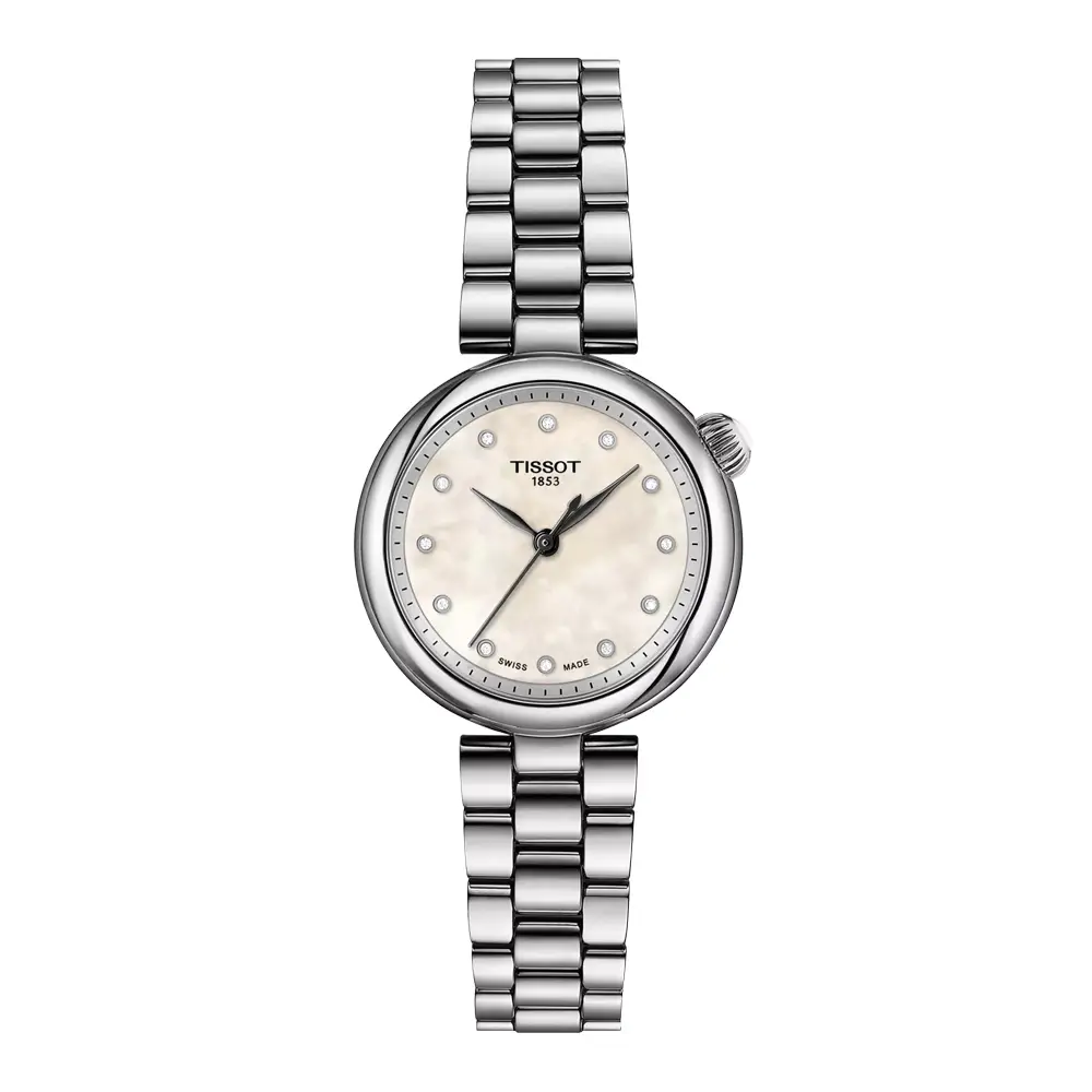 Tissot Desir thể hiện nét đẹp nữ tính thuần khiết với phong cách thanh lịch vượt thời gian. Vỏ thép 316L 28 mm kết hợp cùng mặt số xà cừ độc đáo — mỗi mặt số đều sở hữu hoa văn riêng biệt. Các cọc số được đính 12 viên kim cương Top Wesselton, tạo ánh sáng lấp lánh nhẹ nhàng, tôn lên vẻ sang trọng mà vẫn giữ được sự tối giản tinh tế.