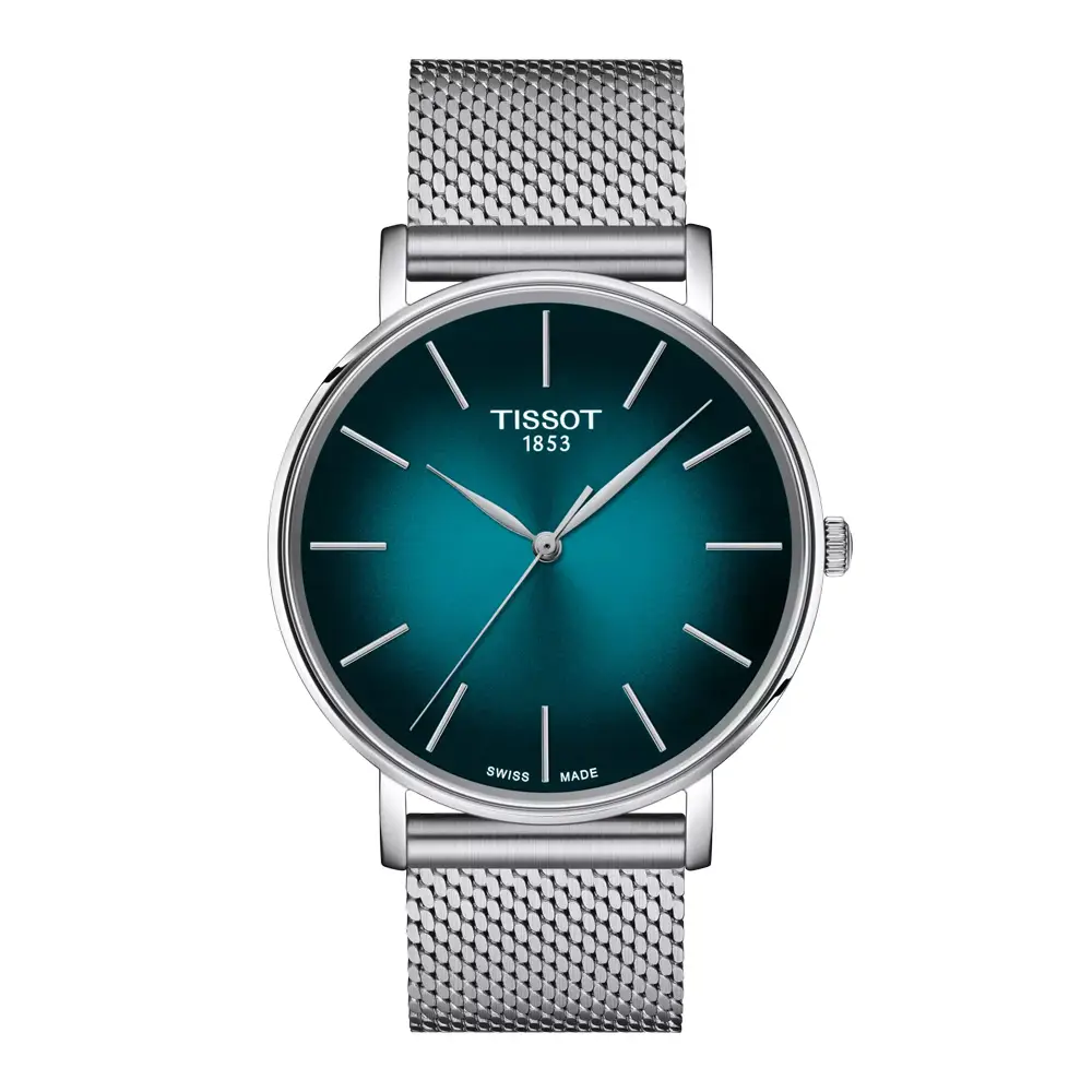 Tissot Everytime Gent (ref. T143.410.11.091.00) mang phong cách tối giản thanh lịch trong một ngôn ngữ hiện đại và vượt thời gian. Điểm nhấn nằm ở mặt số xanh-đen chuyển sắc, mang lại hiệu ứng ánh sáng tinh tế và bố cục analog sạch sẽ. Mặt số được bảo vệ bởi kính sapphire chống trầy, trong khi dây thép dạng Milanese (mesh) tạo cảm giác lịch lãm.