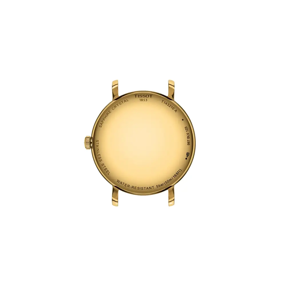 Tissot Everytime Lady T143.210.33.021.00 nổi bật với thiết kế thanh lịch, cổ điển cùng tông vàng ấm áp. Vỏ thép không gỉ 34 mm phủ PVD màu vàng kết hợp hoàn hảo với mặt số champagne hiệu ứng sunray, được bảo vệ bởi kính sapphire chống trầy. Tổng thể mang vẻ sang trọng, dễ phối hợp trong nhiều hoàn cảnh.