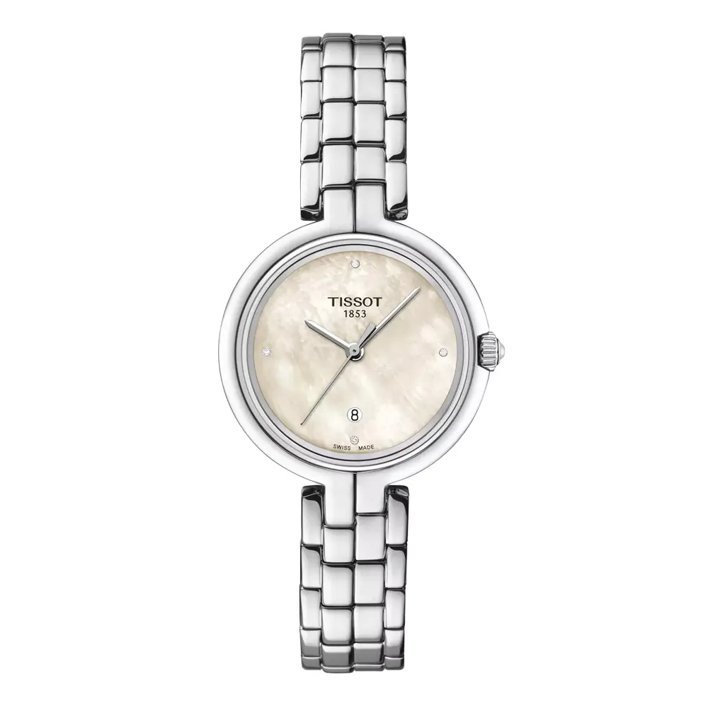 Tissot Flamingo T094.210.11.116.02 mang nét thanh lịch vượt thời gian và nữ tính tinh tế, kết hợp tay nghề Thụy Sĩ cùng phong cách hiện đại. Mặt số xà cừ trắng được điểm xuyến 4 viên kim cương (độ trong VS-SI) tạo hiệu ứng sang trọng nhưng nhẹ nhàng.