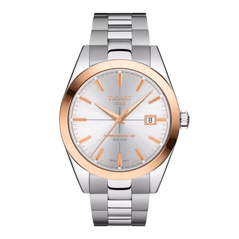 Tissot Gentleman Powermatic 80 Silicium 18K Gold Bezel T927.407.41.031.00 nổi bật với phong cách thể thao tinh tế, kết hợp sự tiện dụng hằng ngày cùng những yếu tố của nghệ thuật chế tác cao cấp. Vỏ thép không gỉ 316L kích thước 41 mm kết hợp vành bezel vàng hồng 18K, tạo nên sự hài hòa giữa vẻ sang trọng và tính thẩm mỹ thực dụng. Mặt số bạc hiệu ứng sunburst làm nổi bật phong cách hiện đại và thanh lịch.