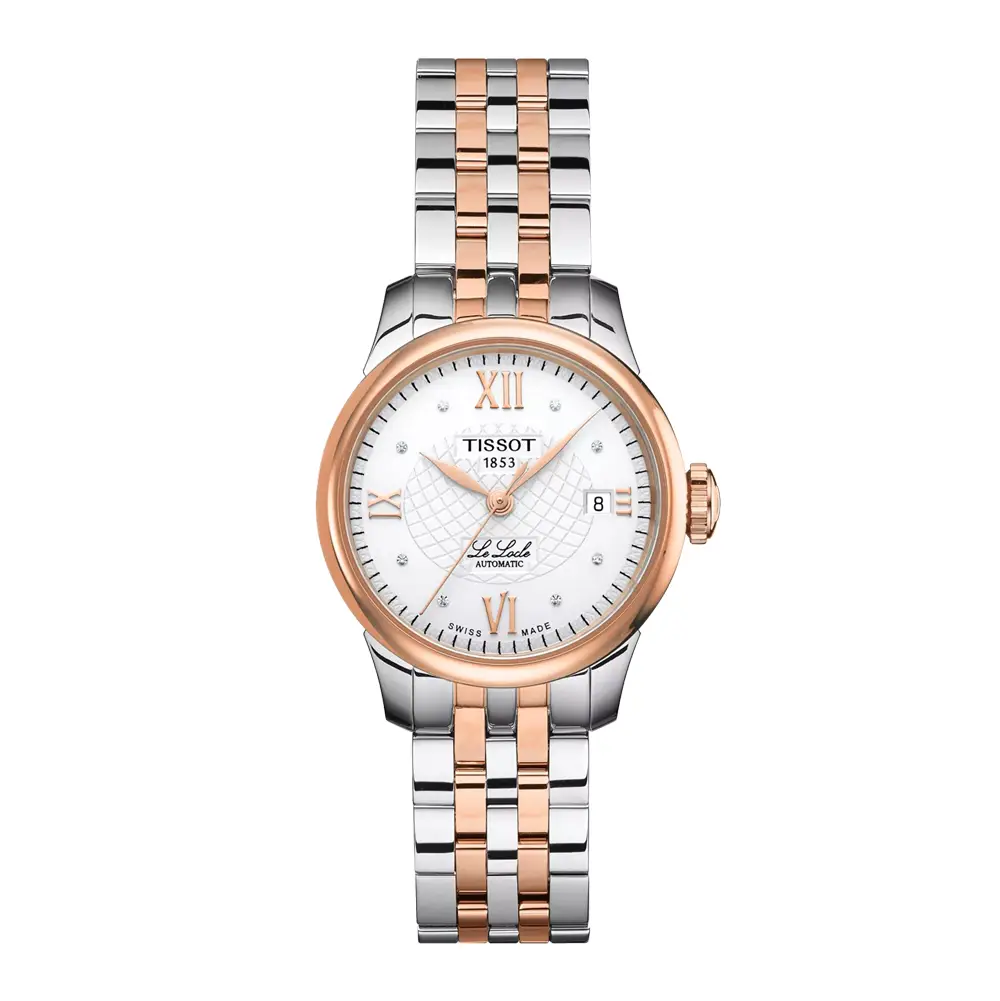 Tissot Le Locle Automatic Lady T41.2.183.16 mang phong cách thanh lịch cổ điển Thụy Sĩ với những chi tiết tinh xảo. Vỏ thép 25,3 mm phủ PVD vàng hồng tạo vẻ sang trọng, trong khi mặt số bạc với số La Mã và 8 viên kim cương mang lại nét nữ tính tinh tế. Dây da nâu giúp tổng thể trở nên trang nhã hơn.