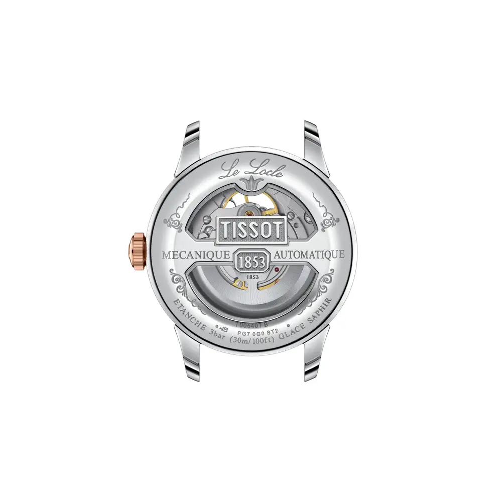 Vỏ thép không gỉ 39,3 mm được trang bị kính sapphire chống trầy, mang lại độ bền cao. Đồng hồ có khả năng chống nước 30 m, cùng hoa văn Le Locle trên nắp lưng thể hiện rõ phong cách thẩm mỹ truyền thống của Thụy Sĩ.