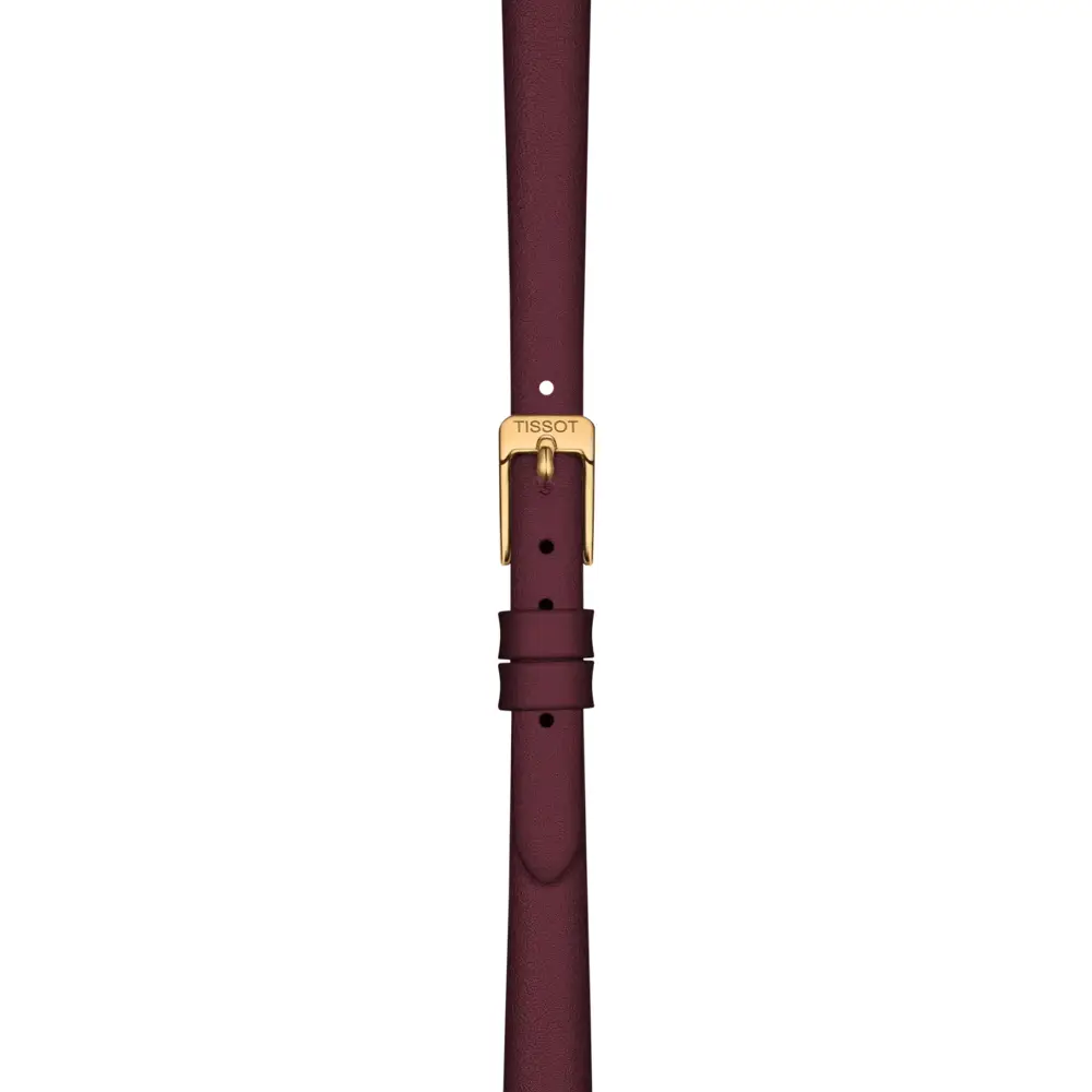 Điểm nhấn là mặt số màu đỏ burgundy kết hợp với kim và cọc số màu vàng, tạo nên vẻ nữ tính. Kích thước nhỏ giúp đồng hồ giống như một món trang sức tinh tế trên cổ tay. Đi kèm dây da cùng tông màu tạo sự hài hòa.
