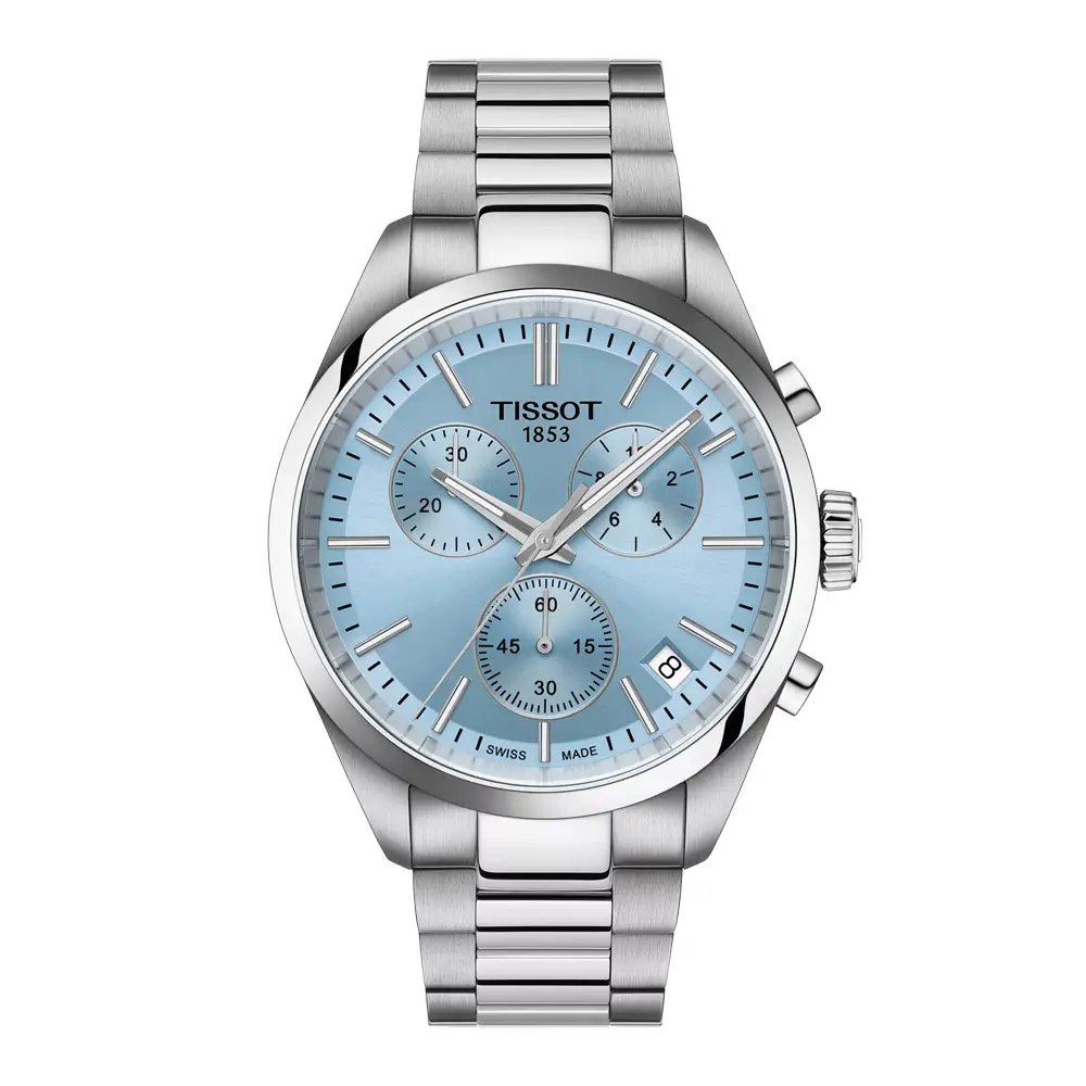 Tissot PR 100 Chronograph T150.417.11.351.00 mang đến sự kết hợp hoàn hảo giữa thiết kế tinh gọn, khả năng ứng dụng cao và độ chính xác Thụy Sĩ. Vỏ thép 316L 40 mm cùng dây thép không gỉ tạo nên vẻ ngoài chắc chắn nhưng vẫn thanh lịch, phù hợp cho cả môi trường công sở và phong cách thường ngày. Mặt số xanh băng (ice-blue) tạo điểm nhấn hiện đại đầy thu hút.