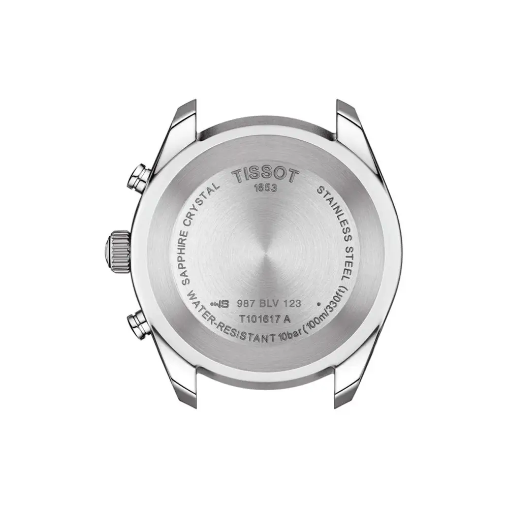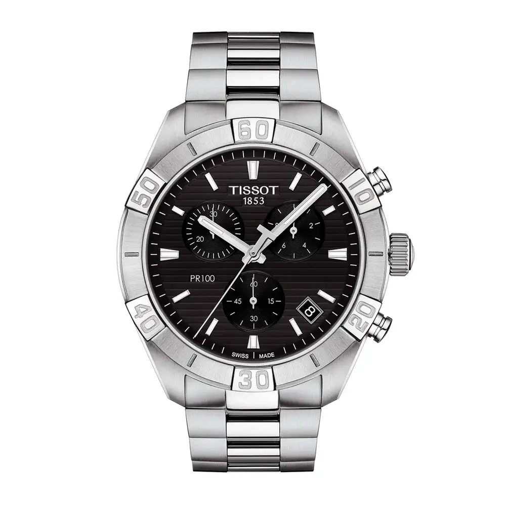 Tissot PR 100 Sport Gent Chronograph T101.617.11.051.00 là sự kết hợp hoàn hảo giữa phong cách thể thao sang trọng, hiệu suất và độ chính xác Thụy Sĩ. Vỏ thép không gỉ 44 mm đi kèm mặt số đen với ba mặt phụ chronograph, kim và cọc số tương phản, giúp dễ dàng quan sát trong mọi điều kiện ánh sáng.