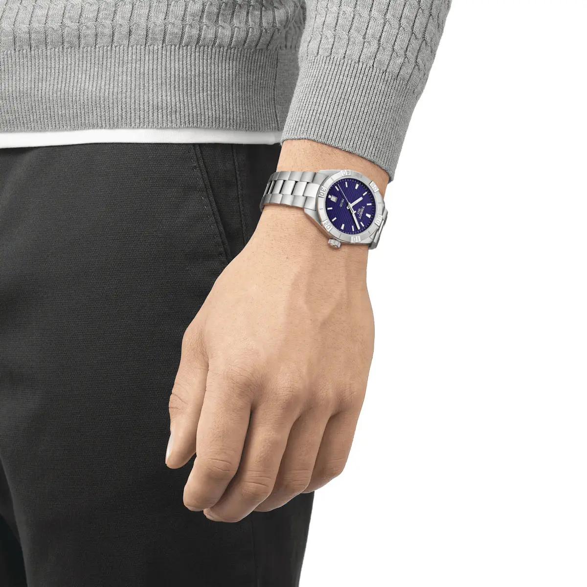 Tissot PR 100 Sport Gent T101.610.11.041.00 là sự kết hợp hoàn hảo giữa phong cách thể thao sang trọng, thiết kế hiện đại và độ chính xác Thụy Sĩ. Vỏ thép không gỉ 42 mm đi kèm mặt số xanh lam hiệu ứng tia mặt trời, cọc số và kim phủ dạ quang, giúp hiển thị rõ ràng trong mọi điều kiện ánh sáng.