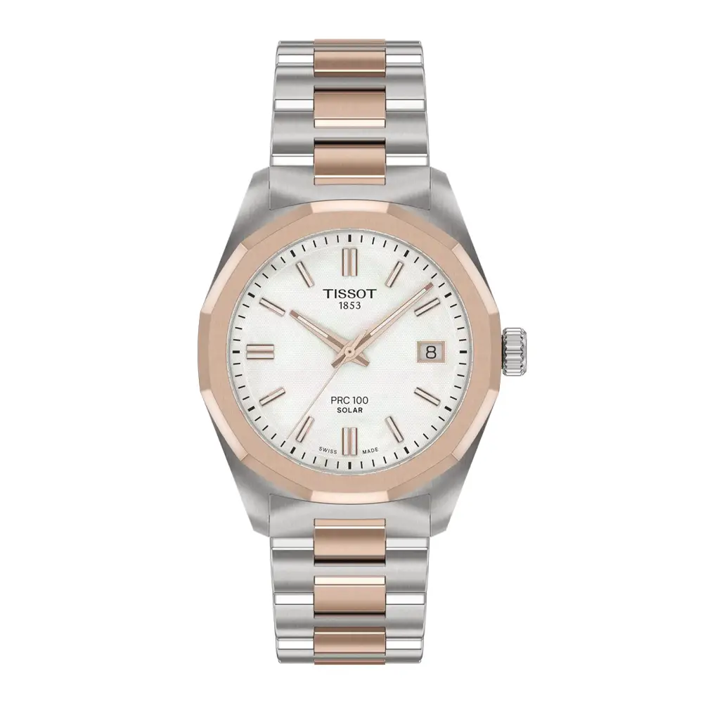 Tissot PRC 100 Solar là mẫu đồng hồ nữ kết hợp vẻ đẹp thể thao thanh lịch với công nghệ năng lượng mặt trời hiện đại. Vỏ 34 mm bằng thép 316L cùng thiết kế hai tông màu với các chi tiết phủ PVD vàng hồng mang đến nét sang trọng nhưng vẫn bền bỉ. Kính sapphire và khả năng chống nước 100 m (10 bar) giúp mẫu đồng hồ phù hợp cho cả sinh hoạt hằng ngày lẫn phong cách năng động.