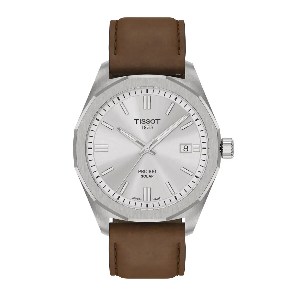 Đồng hồ nam Tissot PRC 100 Solar Quartz T151.422.16.031.00 kết hợp hài hòa giữa công nghệ hiện đại và thiết kế cổ điển. Vỏ thép không gỉ đường kính 39 mm mang lại vẻ ngoài cân đối, trong khi vành bezel mười hai cạnh PRC 100 tạo nên phong cách thể thao thanh lịch, phù hợp cho cả sử dụng hằng ngày lẫn những dịp trang trọng.