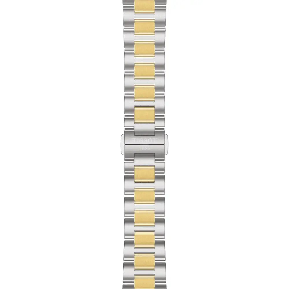 Điểm nhấn là mặt số màu bạc với cọc số thanh lịch, kết hợp với kim phủ Super-LumiNova® giúp dễ đọc trong điều kiện thiếu sáng. Có lịch ngày tại vị trí 3 giờ. Đồng hồ đi kèm dây thép hai màu (thép + PVD vàng) với khóa gập và hệ thống thay nhanh.