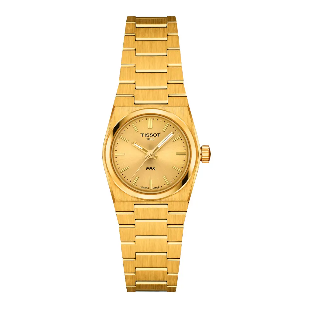 Tissot PRX 25mm T137.010.33.021.00 mang hơi thở retro thập niên 70 trong thiết kế hiện đại và tinh tế. Vỏ thép không gỉ 25mm phủ PVD vàng tạo cảm giác sang trọng, nhỏ gọn – hoàn hảo cho cổ tay phái đẹp.