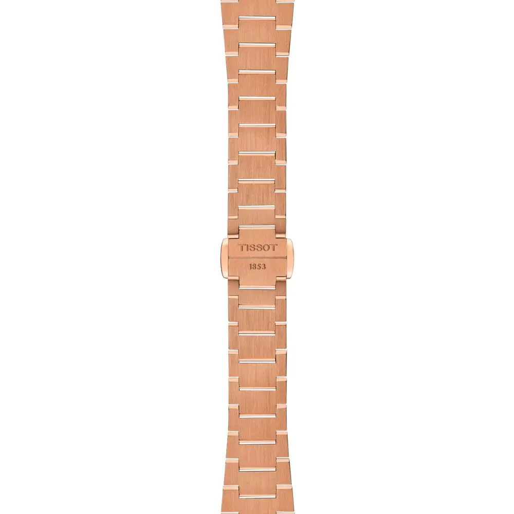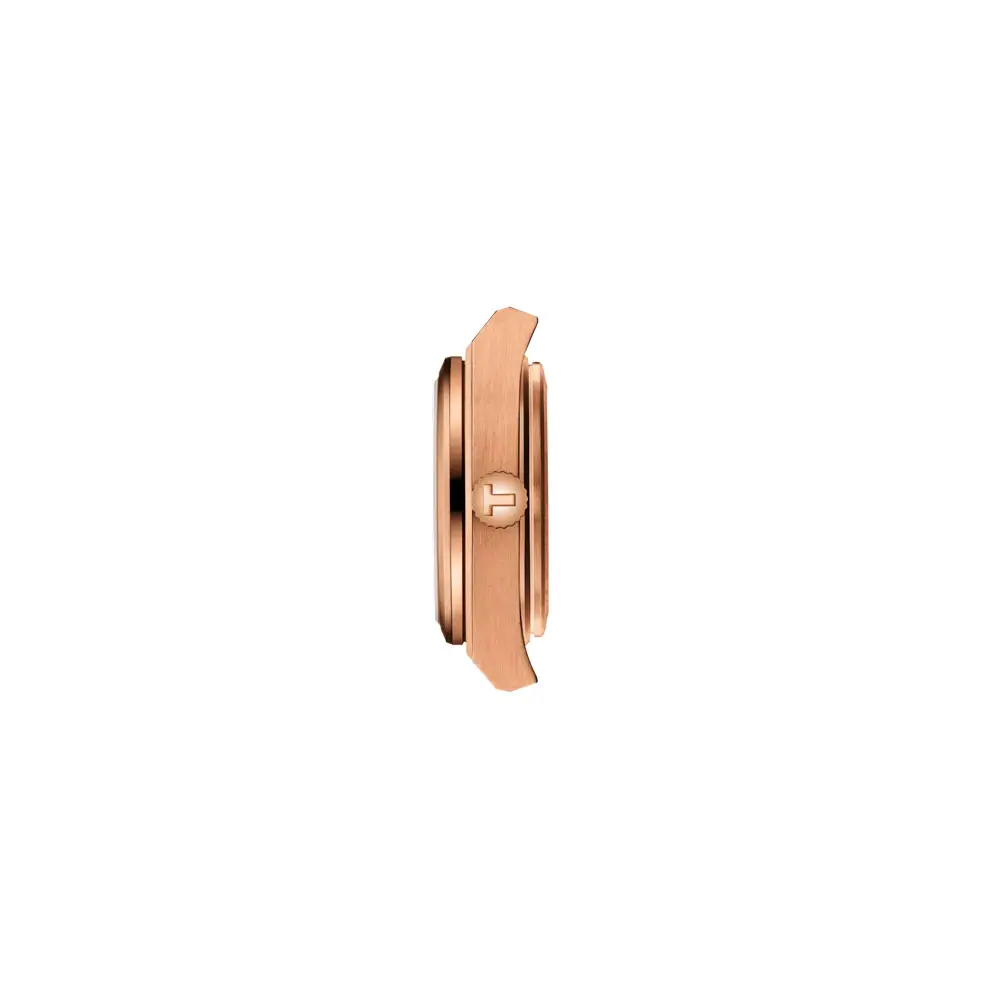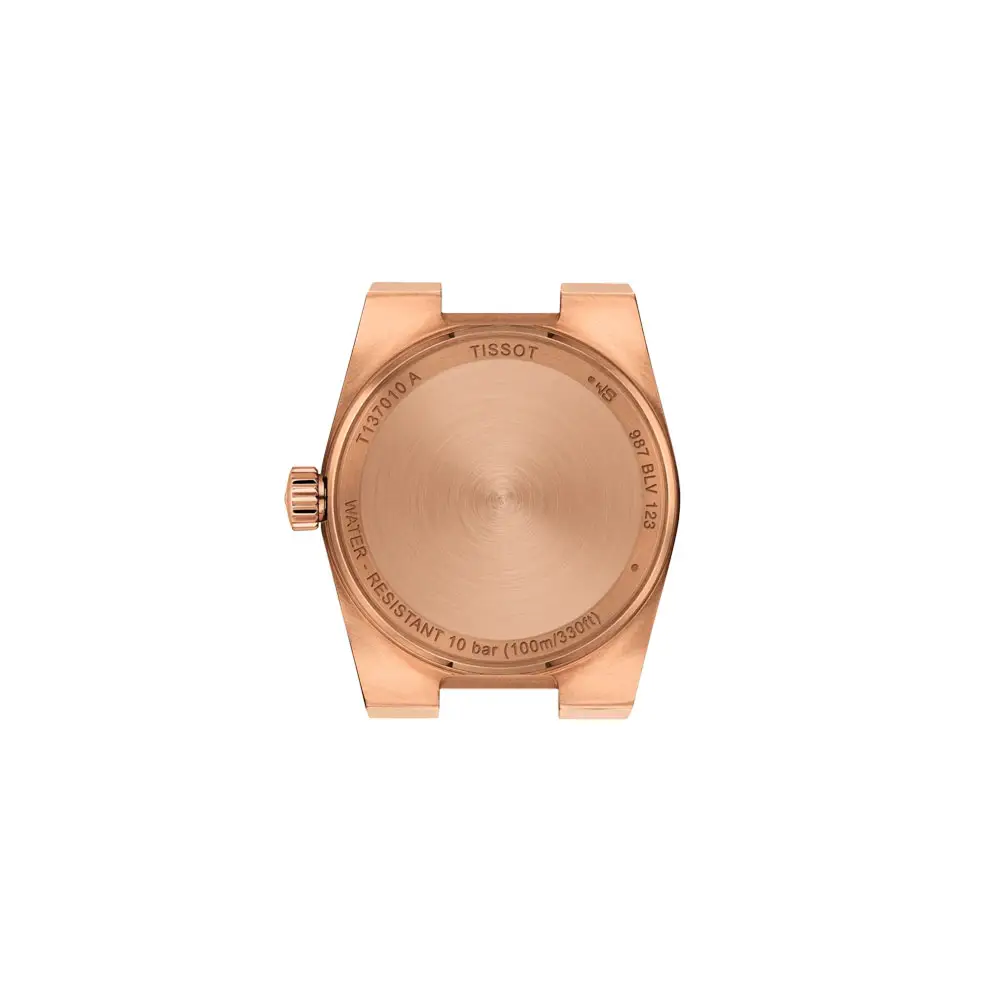 Tissot PRX 25mm T137.010.33.506.00 mang phong cách thiết kế thập niên 70 huyền thoại trong một diện mạo hiện đại và nữ tính. Vỏ thép không gỉ 316L 25mm phủ PVD vàng hồng, kết hợp mặt số nâu ánh mặt trời đầy tinh tế và ấm áp.