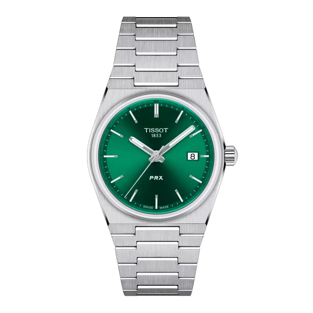 Đồng hồ Tissot PRX 35mm, mã số T137.210.11.081.00, là một mẫu đồng hồ thanh lịch kết hợp phong cách cổ điển với công nghệ hiện đại. Mẫu đồng hồ này có đường kính vỏ 35 mm, được làm bằng thép không gỉ, và mặt số màu xanh lá cây với họa tiết mặt trời. Đồng hồ có dây đeo tích hợp bằng thép không gỉ với hệ thống thay dây nhanh, giúp dễ dàng thay đổi dây đeo.