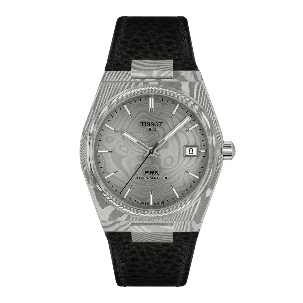 Đồng hồ Tissot PRX Powermatic 80 Damascus Steel kết hợp thiết kế retro biểu tượng của bộ sưu tập PRX với kỹ nghệ chế tác hiện đại. Điểm nhấn của mẫu này là vỏ thép Damascus đường kính 38 mm, với hoa văn độc đáo khiến mỗi chiếc đồng hồ trở nên hoàn toàn khác biệt. Mặt số màu xám hài hòa cùng các cọc số tinh tế, kim phủ dạ quang và lịch ngày tạo nên tổng thể cân đối, trong khi kính sapphire phủ chống phản xạ đảm bảo khả năng quan sát tối ưu.