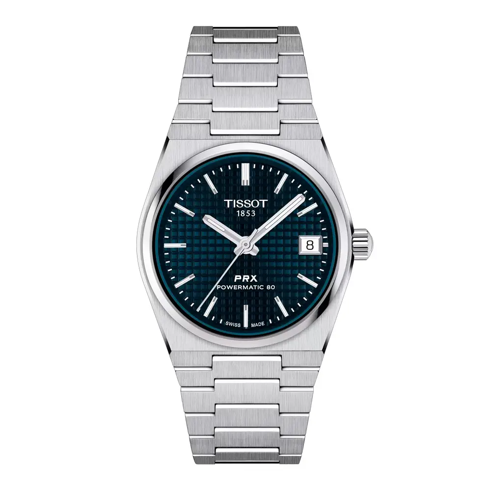Tissot PRX Powermatic 80 35mm T137.207.11.041.00 mang đến tỷ lệ tinh tế, hiệu suất cơ học và thiết kế biểu tượng của dòng PRX. Vỏ đồng hồ 35 mm bằng thép không gỉ 316L được trang bị kính sapphire chống trầy xước. Mặt số xanh họa tiết dạng lưới với kim phủ dạ quang và lịch ngày tại vị trí 3 giờ tạo nên vẻ cân đối và hiện đại.