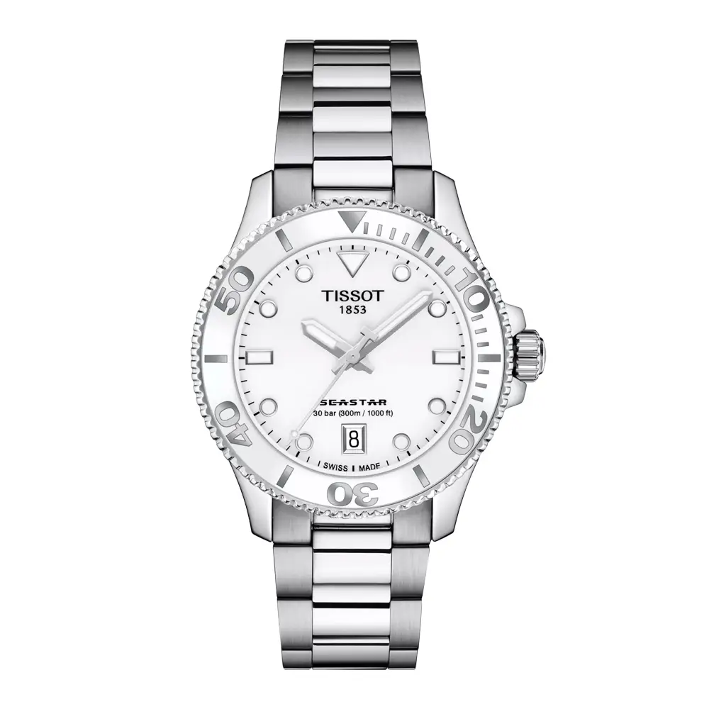 Tissot Seastar 1000 36mm T120.210.11.011.00 mang đến khả năng lặn chuyên nghiệp và độ chính xác Thụy Sĩ trong thiết kế nhỏ gọn, tinh tế. Vỏ thép không gỉ 316L 36mm đi cùng mặt số trắng và vòng bezel xoay một chiều, tôn lên vẻ năng động và sang trọng.